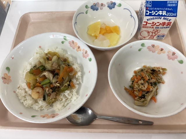 中華丼、牛乳、きのこの中華サラダ、フルーツポンチ