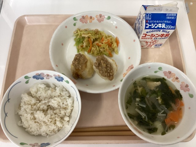 ごはん、牛乳、揚げ豆腐の肉味噌がけ、油揚げと野菜の和物、鶏肉と春菊のすまし汁