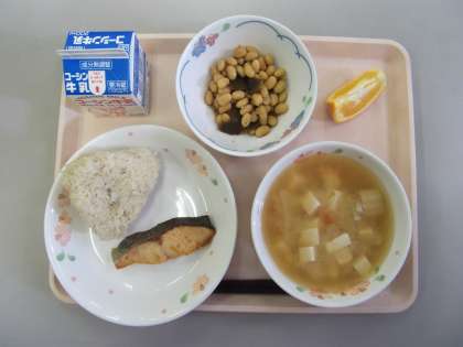 じゃこおにぎり/牛乳/鮭の塩焼き/昆布豆/おふと豆腐の味噌汁/いよかん