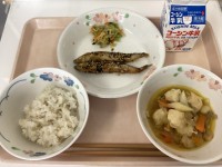 桃太郎の昔話にきび団子をもって鬼を退治した話があります。そのきびという穀類をおこめと一緒に炊いた桃太郎ごはんです。きびは、黄色い実なので黄色い実がつまってきびになったそうです。きびのほかにジャコも入れました。桃太郎のように丈夫な子になるように考えたご飯です。ししゃも磯辺揚げのししゃもは、頭からしっぽまで食べられる魚です。よく噛んで食べましょう。