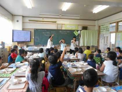 6年生が、「5年生がんばれ集会」に向けて、2年生に応援の仕方を教えています。