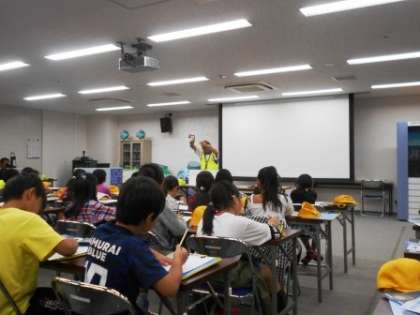 レクチャールームで、水をきれいにするバクテリアの話を聞きました。