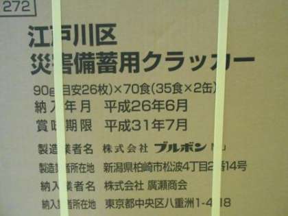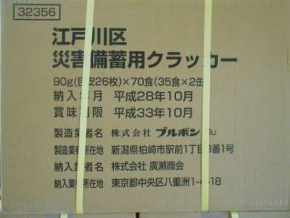 10/23 備蓄用クラッカー入れ替え 公開日 2018/10/23 更新日 2018/10/23 できごと 賞味期限が迫っている備蓄用クラッカーの入れ替え作業がありました。 新しいクラッカー いいね(0)