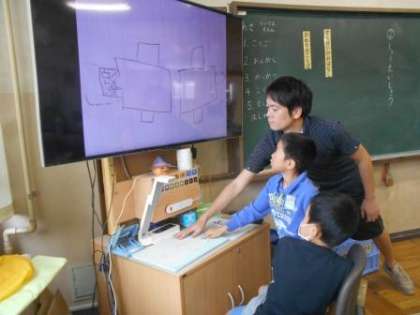 自分の考えを書画カメラでテレビに大きく映し、みんなに説明します。