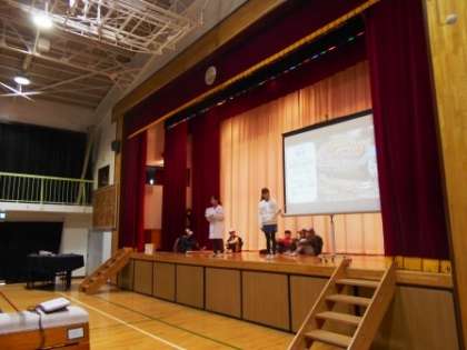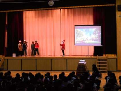 東日本大震災をはじめとする、地震や台風、竜巻などの自然災害による被害を、全校児童に代表委員が分かりやすく説明しました。
