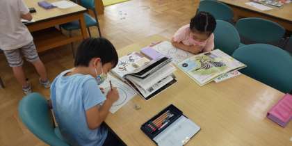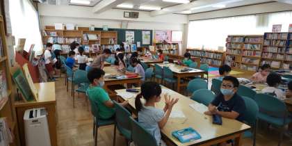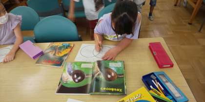 江戸川区では、読書科という学習を推進しています。本に親しむため、読んだり、調べ学習をしたりと、図書館の活用に力を入れています。これは2年生の調べ学習の様子です。