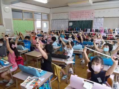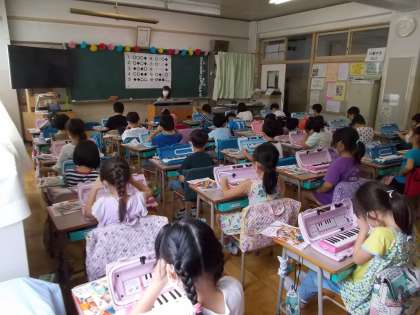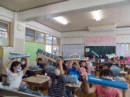 今日は、1年生が音楽の授業で、初めてけんばんh-モニカを使っていました。楽器の演奏もできることから徐々に始めています。