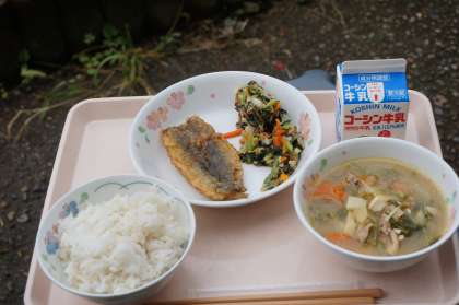 今日の給食は、小雨の降る中での撮影