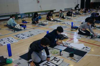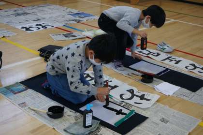 今日は校内書きぞめ大会の初日で、3年生、4年生が書ぞめをしました。