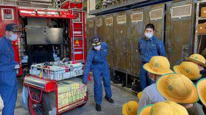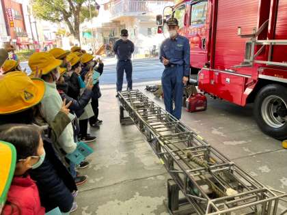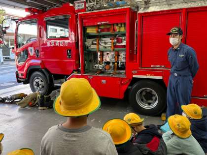 もう一つのグループは、外で消防車や装備品などを、実際に触らせていただきながら、説明を聞きました。一つ一つの重さに驚きながら、興味深そうに見学していました。