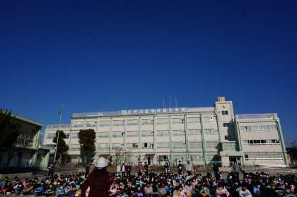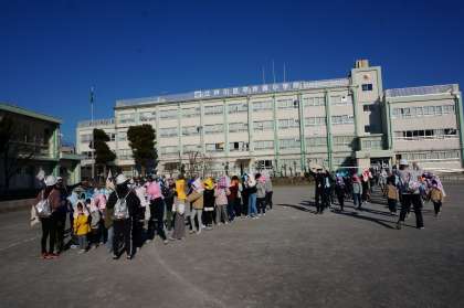 強度の地震発生→放送機器使用不可→伝令→校庭へ