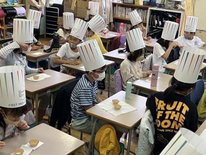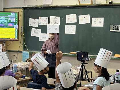 区小研の食育の授業として、「味覚」に関する授業を行いました。五感の話や、基本の味覚の話など、子供たちはコックさんの帽子をかぶり、積極的に発言しながら、楽しんで取り組んでいました。