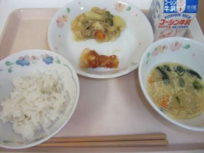 今日の給食は、「ごはん、牛乳、イカのチリソース、にくじゃが、かんぴょうとたまごのすましじる」です。