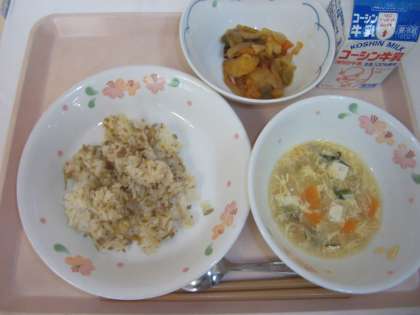 今日の給食は、「じゃこチャーハン、牛乳、レバーのすぶたふういため、サンラータン」です。