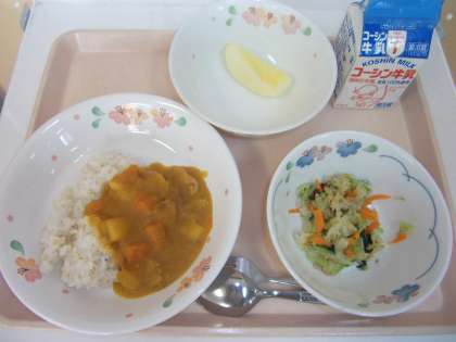 今日の給食は、「ポークカレーライス、牛乳、パリパリれんこんサラダ、りんご」です。