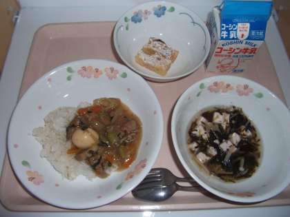 給食は、「ちゅうかどん、牛乳、のりスープ、ようなしのヨーグルトケーキ」でした。