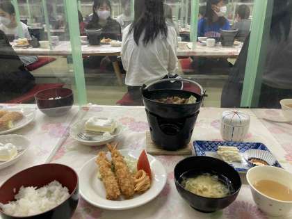 第1日目の晩ご飯は、エビフライとすき焼きのダブルメインです。