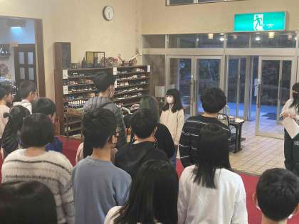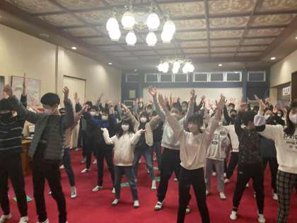 朝方の雨で地面が濡れているため、ロビーでの朝会となりました。