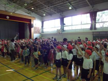 今朝は、体育館で『運動会の歌(ゴーゴーゴー)』と『校歌』の練習をしました。