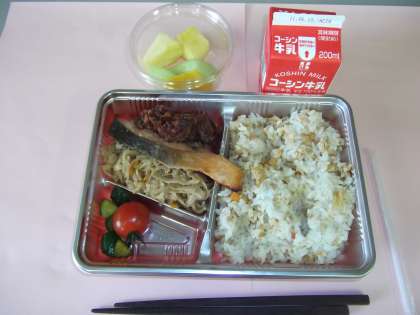 今日は、『なかよし給食』です。お弁当給食を縦割り班で楽しくいただきます。