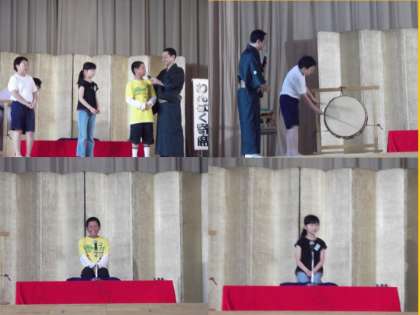 代表のお友だちが舞台にあがって小噺やお囃子の体験をしました。