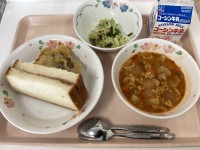 揚げパン・牛乳 冬野菜のクリーム煮 糸寒天サラダ うさぎリンゴ