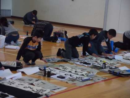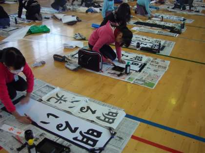 体育館で書初め大会です。
