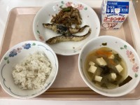 たけのこごはん マスのしおこうじ焼き かわりきんぴら すりごまの味噌汁 かわちばんかん
