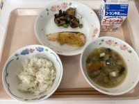 ごはん、牛乳、マスのさざれ焼き、ひじきとじゃがいもの煮物、野菜けんちん汁
