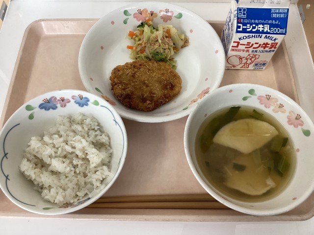 じゃこごはん、牛乳、ごぼうコロッケ、キャベツのにんにく醤油和え、せんべい汁