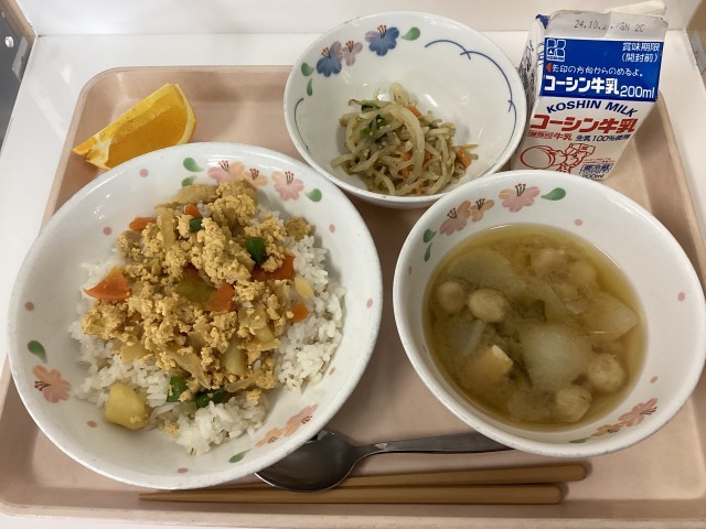 親子丼、牛乳、もやしのごま和え、かぶとお麩の味噌汁