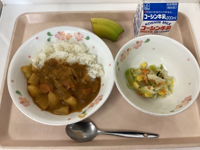 ポークカレーライス、牛乳、キャベツの塩もみ風サラダ、バナナ
