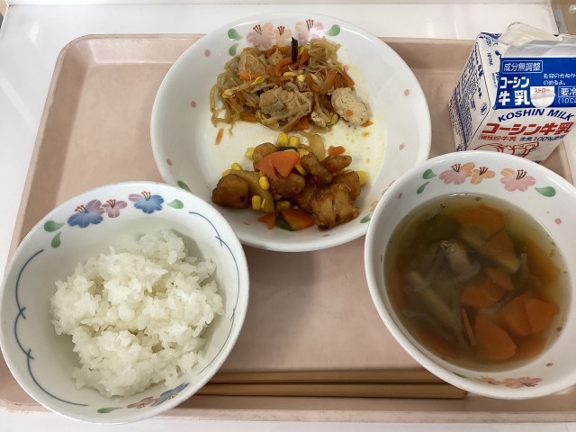 魚沼産コシヒカリ、牛乳、ホキとコーンの揚げ煮、だいかい、のっぺ