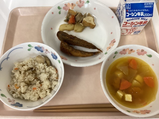 鳥飯、牛乳、メヒカリの唐揚げ、厚揚げと野菜の炊き合わせ、ざぶ汁