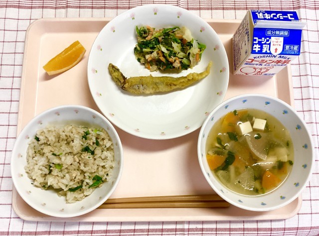 ごはんには、鶏そぼろと小松菜を混ぜました。