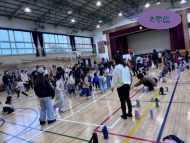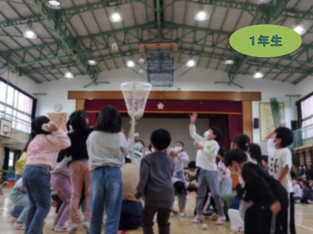11月27日に1、2年生の学年行事として「親子玉入れ大会」を行いました。体育館にて5時間目に1年生、6時間目に2年生の各3クラスによる総当たり戦です。