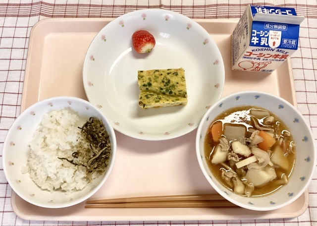 じゃこ海苔ふりかけごはんと卵焼き、芋煮・