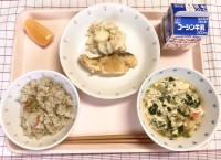 ごまはちみつトースト 豆のサラダ 白菜のクリームシチュー 牛乳
