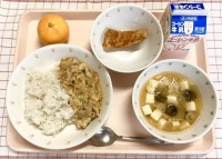 小松菜チャーハン レバーのケチャップあえ 中華風ポテト わかめスープ せとか