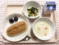 チキンライスにワカサギのフライとサツマイモのポタージュを組み合わせた洋食の献立で...