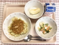 主食は、小松菜とツナのカレーピラフです。北海道産真ホッケのフライは、身がホクホク...
