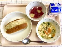 ツナポテトドッグと洋風かきたまスープの献立です。パンにじゃがいもや玉ねぎやツナを...