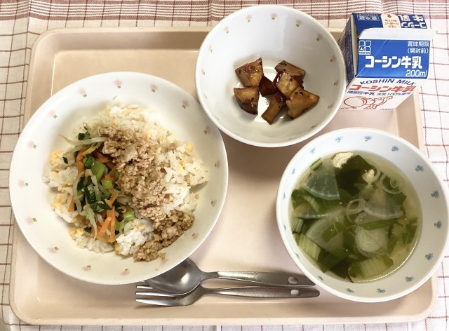 「全校学校給食週間」最終日の献立は、ビビンバ・しんとリ菜のスープ・大学芋です。江...