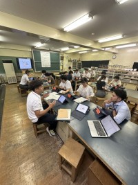 2学期最初の書写の学習を行いました。この日の学習は「おれ」です。これまで横画、縦画を学習してきました。いずれも筆を半紙においた「点」をそのまま横や縦に移動させて書きました。「おれ」は横画の終筆の「点」を縦画の始筆として書きます。「おれ」の難しいのは「点」を始筆から終筆まで維持するところです。気をつけて書かないと平仮名の「つ」のように折れる所が曲がってしまいます。この日の学習では「おれ」を何度か練習して、最後に「日」を書きました。どの児童も、お手本を見ながら「おれ」に気を付けてとても上手に書くことができていました。次回の清書で練習した成果を出してもらいたいと思います。