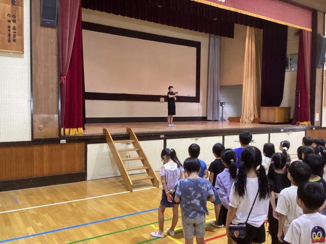 本日の全校朝会では、図書委員会の委員長が全校児童に向けて、読書月間の取り組みについて紹介しました。