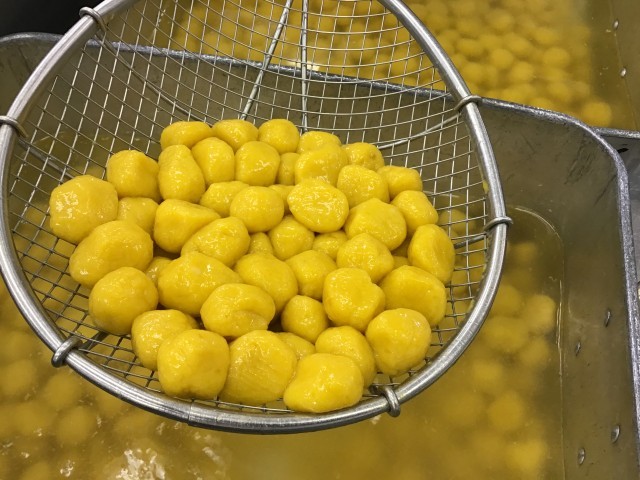 蒸したかぼちゃを練りこんで、黄色い白玉団子を作りました。お月様に見えますか?