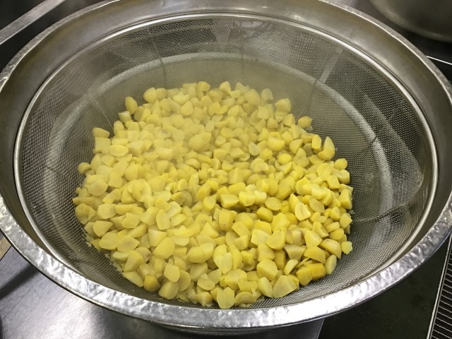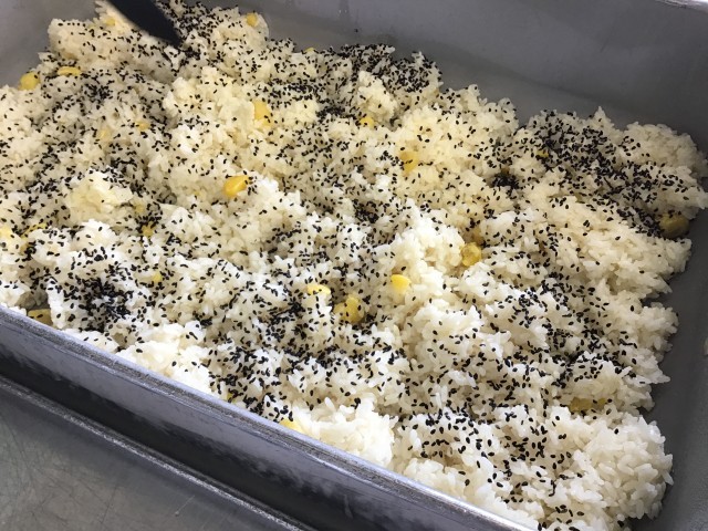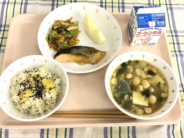 ほんのり甘く煮て、もち米入りのごはんに混ぜ、ごま塩をふりました。