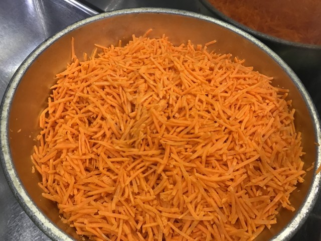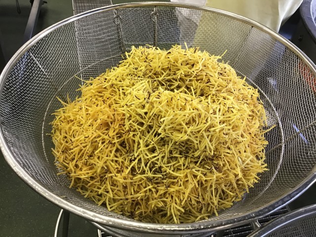 さつまいもは、細く切って油で揚げてから、炒めています。