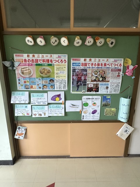給食掲示板が、秋の食材をテーマにした掲示に変わりました。