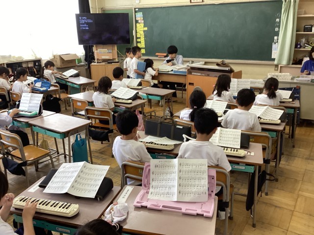 10月14日(火)4校時、1年生が音楽の学習で、鍵盤ハーモニカを使って「よろこびのうた」を演奏しました。